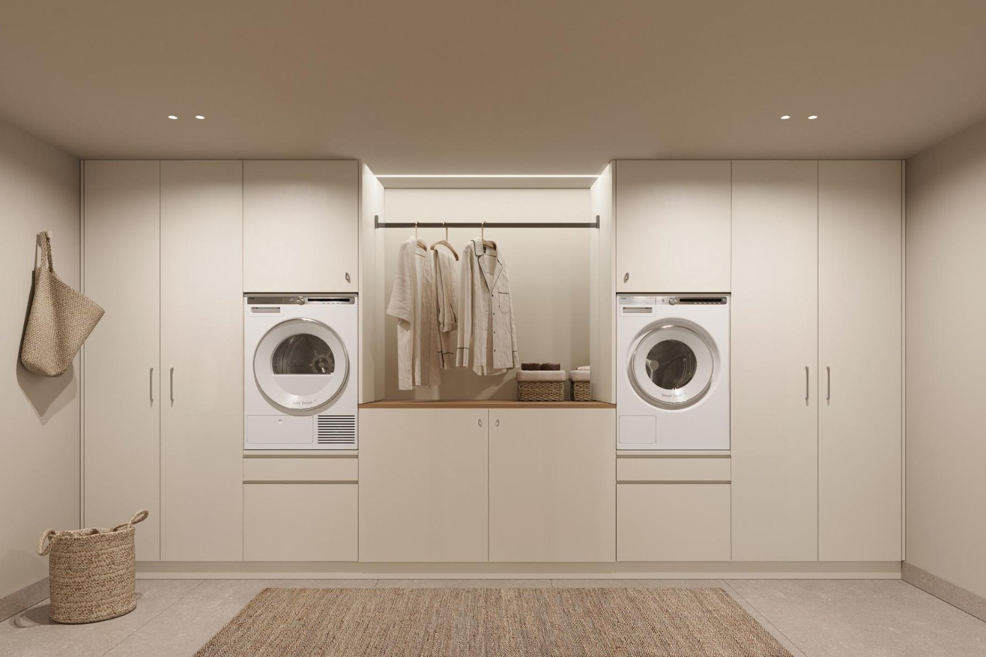 Chaque villa est répartie entre le rez-de-chaussée et le sous-sol, offrant plus de 300 m² d'espace habitable. L'agencement comprend 4 chambres, toutes avec salle de bains attenante, des toilettes supplémentaires pour les invités, ainsi qu'une cuisine ouverte lumineuse et un salon avec accès direct à la terrasse et à la piscine. Le sous-sol comprend un garage, une buanderie et un débarras, garantissant praticité et commodité.