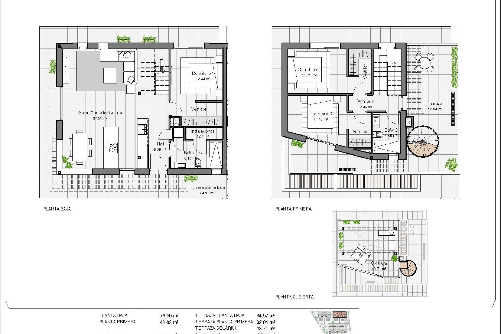 Propriétés modernes avec 3 chambres spacieuses avec armoires encastrées (la principale au rez-de-chaussée, avec salle de bain et dressing en suite), 2 salles de bain spacieuses, grand salon-salle à manger avec cuisine ouverte, terrasses spacieuses.